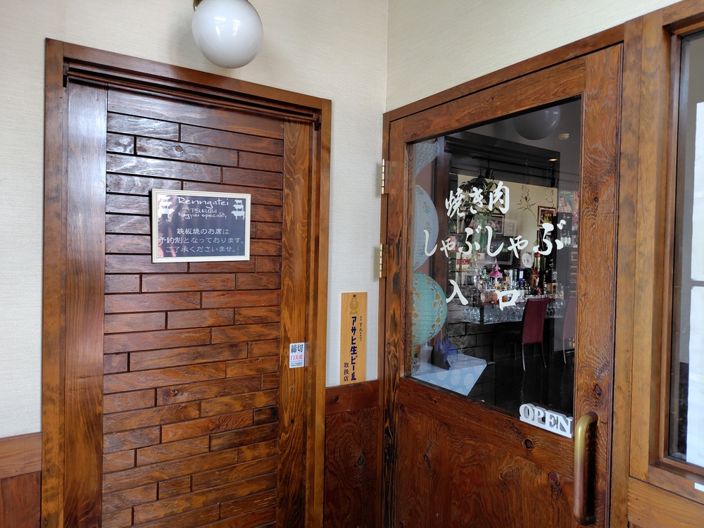店内に入ると、扉がわかれており、「鉄板焼き(要予約)」と、「焼肉しゃぶしゃぶ入口」と書かれていました。今回は「焼肉しゃぶしゃぶ入口」のほうの扉から入ります。