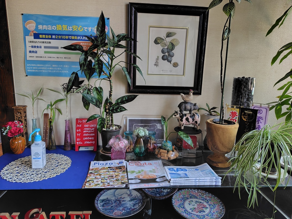 ユニークなオブジェ、観葉植物、奥に貼ってあるポスターなど、見ているだけで楽しめます。