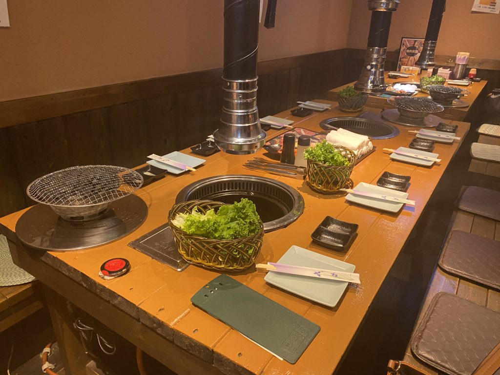 店内はボックスタイプの席もありますが、大人数だったため、みんなで並んで座れる席に案内いただきました。これぞ焼肉店!といった感じで排気ダクトが天井に向かって伸びています。