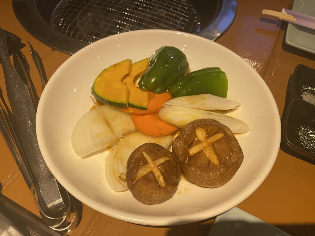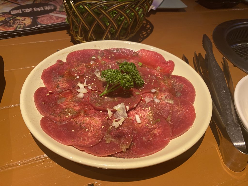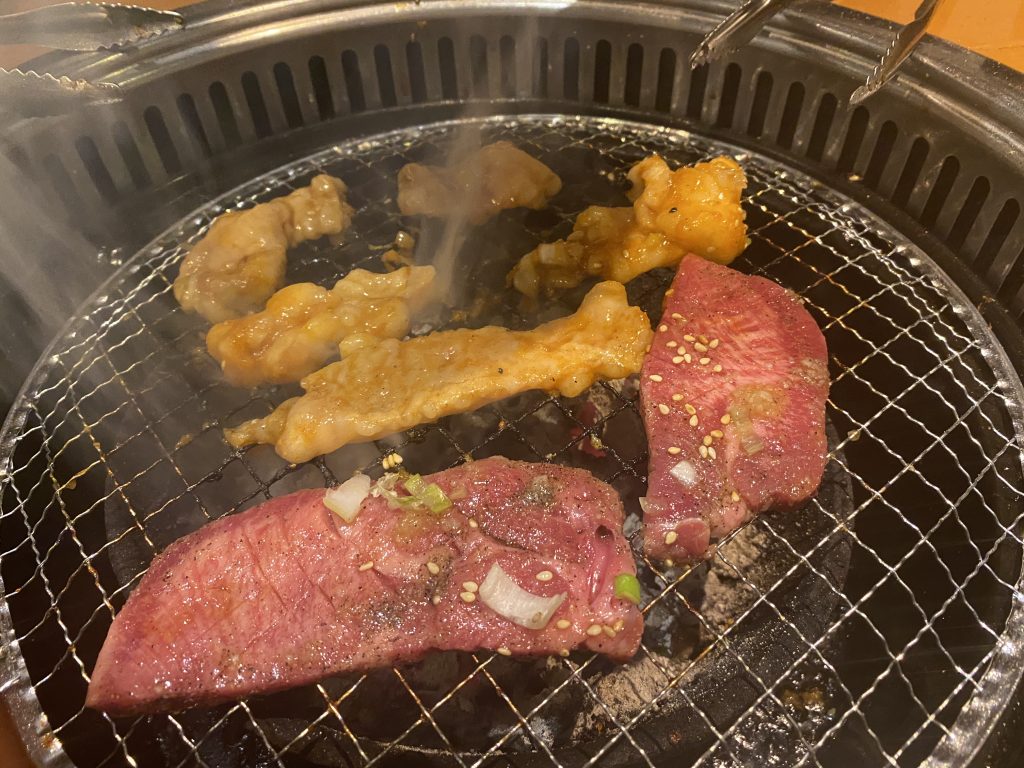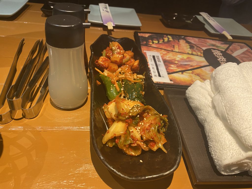 キムチ盛り合わせに牛タン、ハラミ、ロースなど。