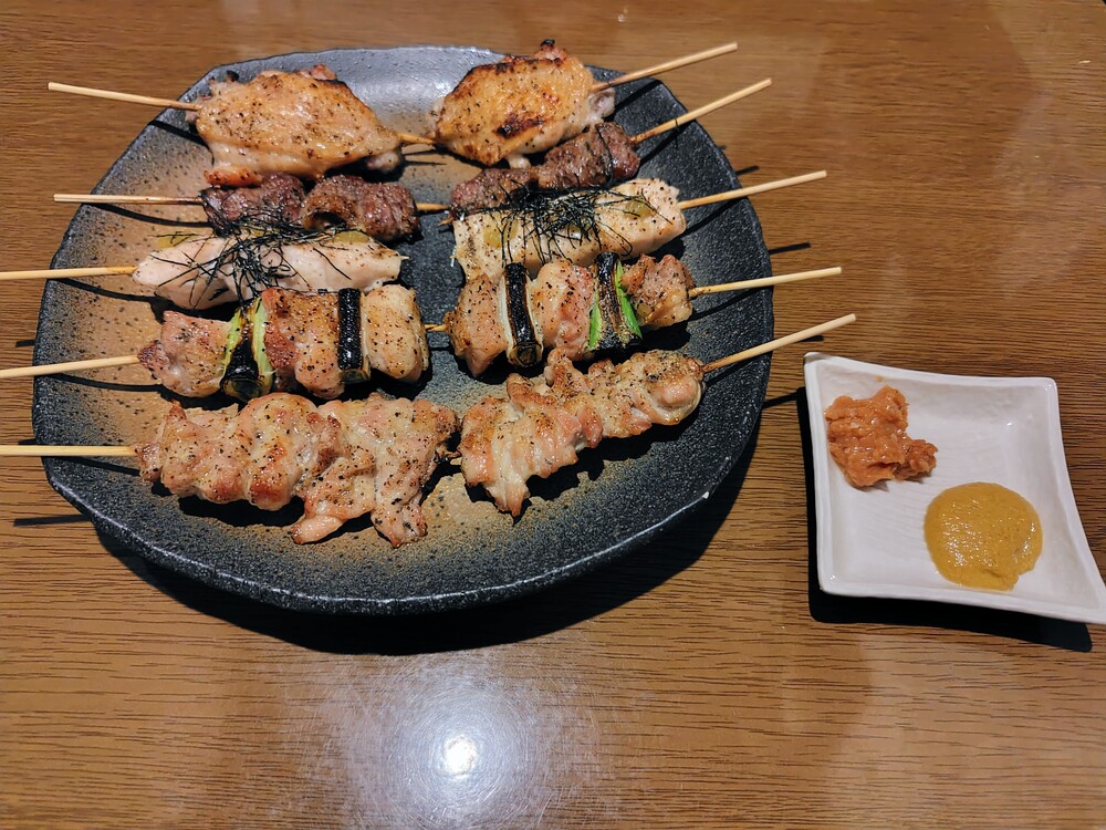 串焼き10本の内容は、くび、ねぎま、ささみ、はつ、手羽先がそれぞれ2本ずつ。肉みそと、からしもついています。今回2人で来店したので、2本ずつだとケンカにならないのもいいですね(笑)