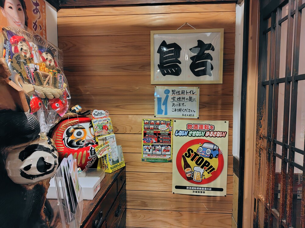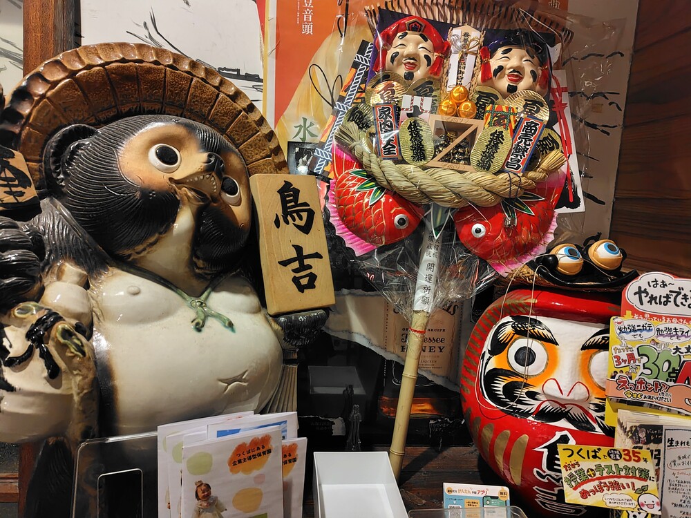 お店の外扉を開けると、なんとも愛らしい「たぬき」と「ダルマ」が出迎えてくれます。まるで誰かの家の玄関のような雰囲気です。内扉の引き戸をガラガラと開けると「いらっしゃいませ!」という店員さんの元気な声が聞こえてきました。