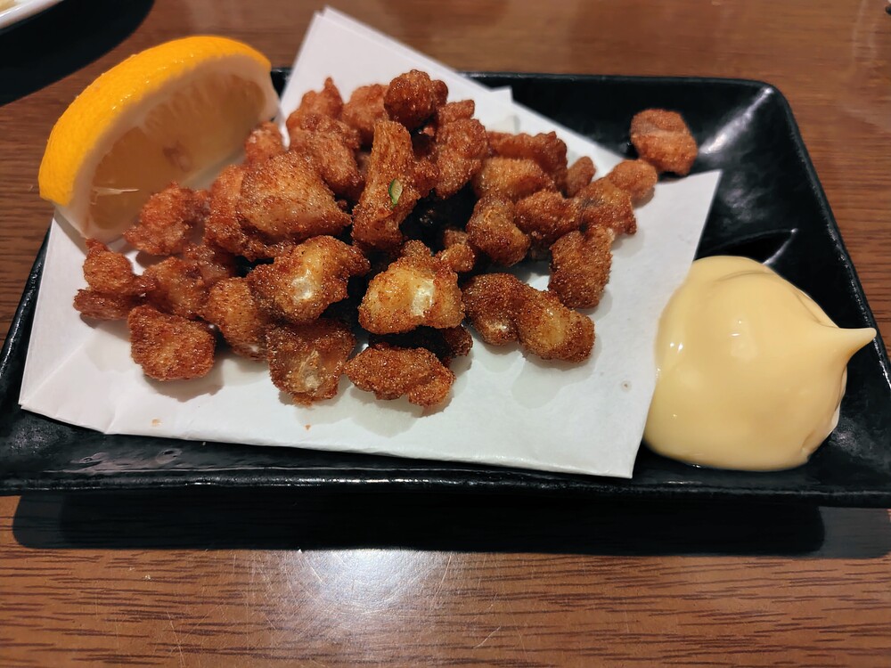 表面はカリッとしていて、中はコリコリで食感がよく、味付けが絶妙でどんどん食べてしまいます。レモンとマヨネーズが添えられているのもうれしいですね。