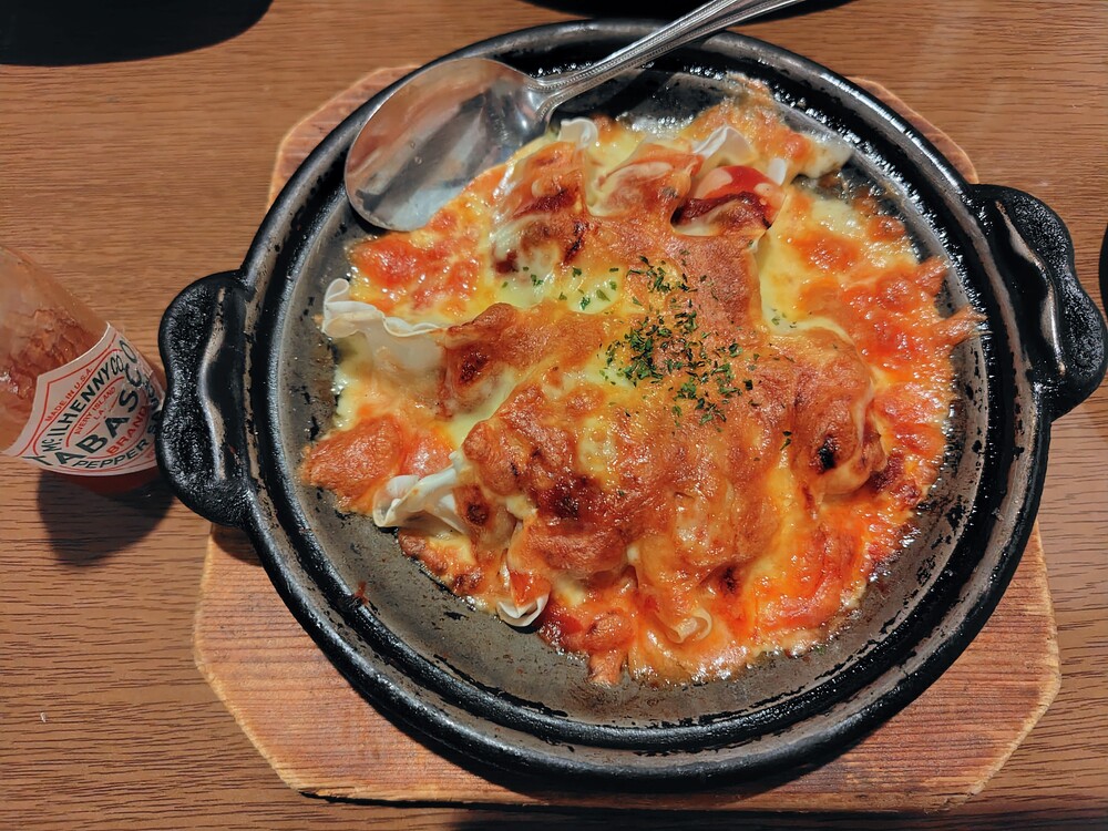 餃子のラザニアという意味らしく、シート状のパスタの代わりに餃子を使っているそうです。こんがりと焼けたチーズとソースのよい香りが食欲をそそります。