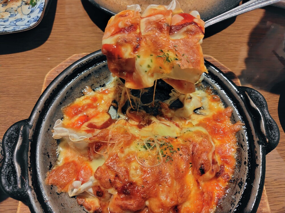 あつあつの鉄板で提供されるので、焦げたチーズがお好みの方はそのまま少し待つとさらにカリッとした食感を楽しめそうです。