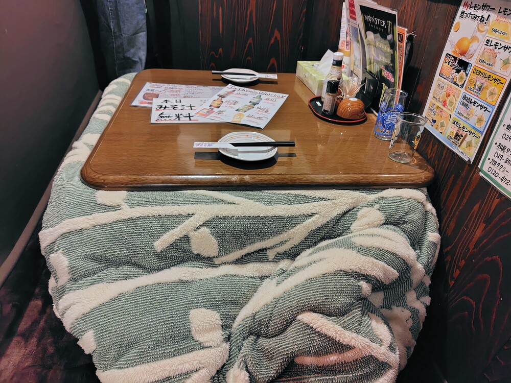 席はカウンター、テーブル、座敷があり、その一部は個室や半個室としての利用も可能です。冬の期間はお店としては珍しい「こたつ」も用意してあります。