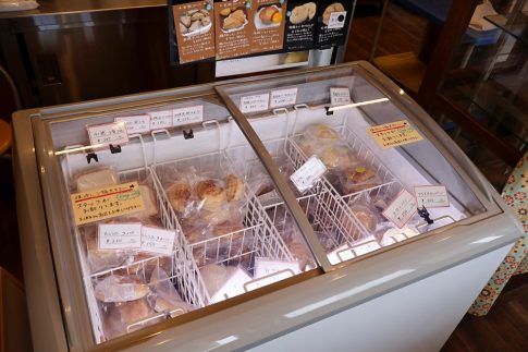 こちらのベーカリーの特徴は、卵、乳製品を使用しないグルテンフリーの米粉パンというだけでなく、その販売形態が全て「冷凍パン」ということ。店内の冷凍庫の中にできあがりのパンが保管されています。