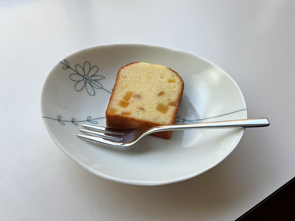 こちらのパウンドケーキ、香りがすごくいいです。そしてグレープフルーツほどではありませんが、うっすらとした苦みがアクセントになっていました。紅茶が欲しくなります!