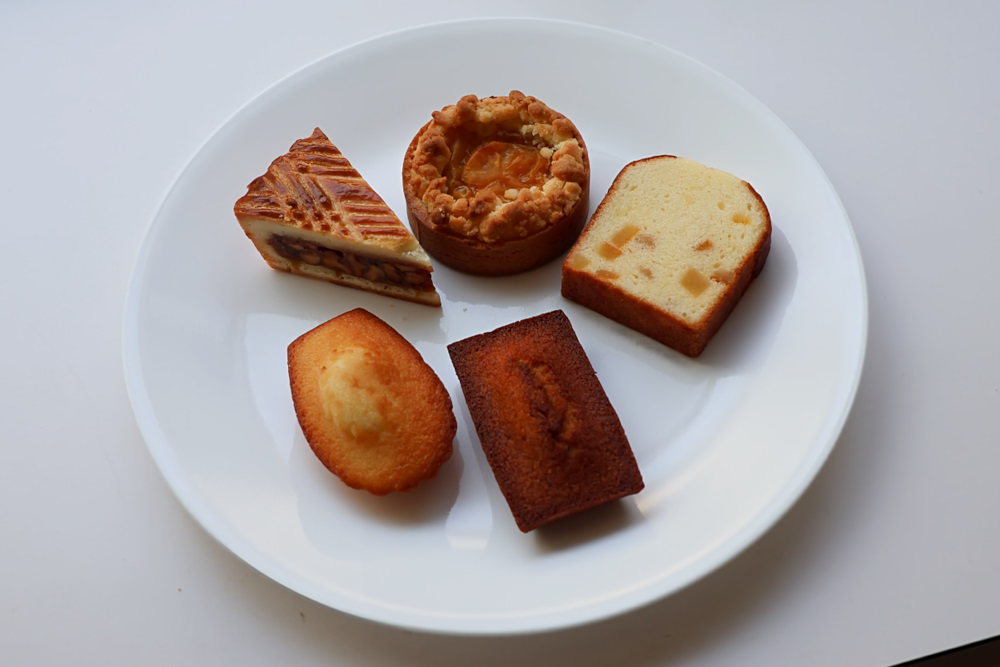 今回購入したのは5品目。写真下の段の左から右回りに、百花蜜(ひゃっかみつ)のマドレーヌ(税込280円)、エンガディーナ(税込380円)、南高梅(なんこううめ)のタルト(税込480円)、宇和ゴールドのケーク(税込350円)、フィナンシェ(税込300円)です。