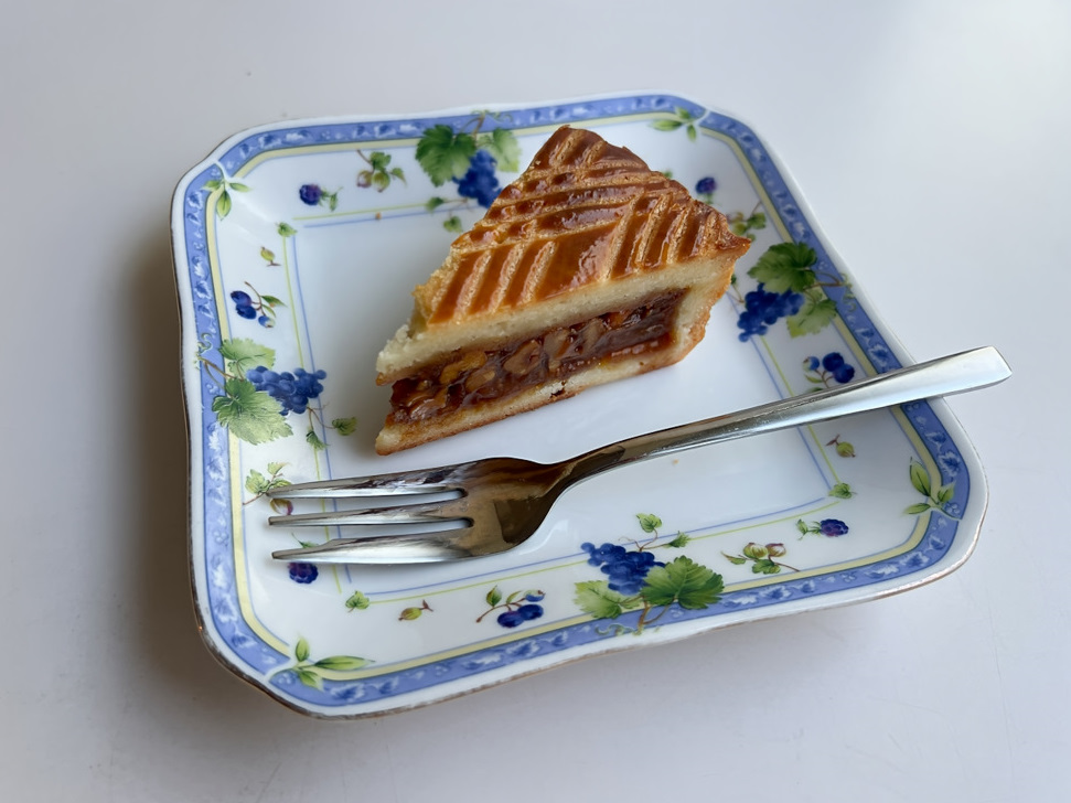 こちらエンガディーナはスイス・エンガディン地方の伝統的なお菓子。くるみなどのナッツ類が入ったヌガーをビスケット生地で包んで焼いたものです。